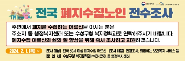 이번 전수조사는 지난해 연말 보건복지부의 2023년 폐지수집 노인 실태조사 결과 및 지원대책 발표에 따른 조치다.