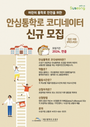 지역 초등학생 학부모와 초등학교 졸업생 학부모를 코디네이터로 모집하며, 신청 방법 등 자세한 사항을 알고 싶다면 수성구청 교통과(☎666-3035)로 문의하면 된다.
