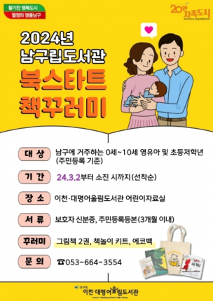 ‘북스타트’ 책꾸러미 배부 관련한 자세한 사항은 남구립도서관(☎053-664-3554)으로 문의하면 된다.