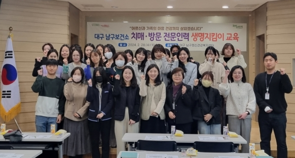 대구 남구는 지난 28일 남구보건소 대강당에서 치매안심센터와 방문보건 전문인력(간호사, 사회복지사, 작업치료사, 임상심리사) 30명을 대상으로 「노인 관련 종사자를 위한 생명지킴이 교육」을 실시하였다고 밝혔다.