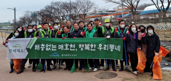 | ↑↑ 대구 수성구는 해충 확산에 대비해 매호천 환경정비를 실시하고 참석자들과 기념 촬영하고 있다. |