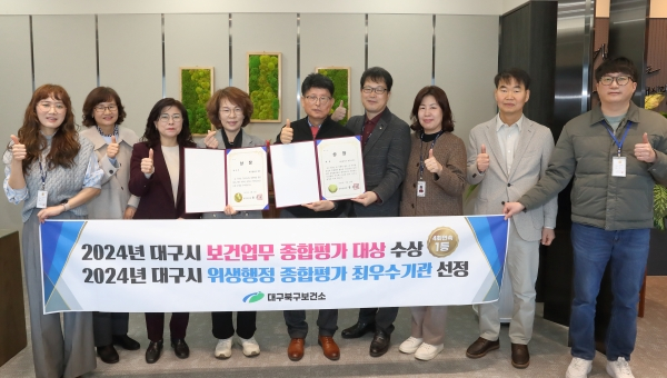 대구 북구보건소는 대구광역시에서 실시한 2024년(2023년 실적) 보건업무 종합평가 및 위생행정 종합평가에서 최고상을 수상하였으며, 이번 수상으로 북구보건소는 상사업비 1천만원을 받게 된다.