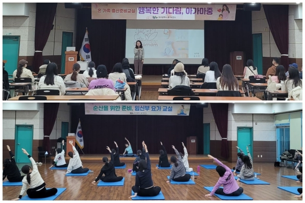 | ↑↑ 온가족 출산준비교실 「행복한 기다림, 아가마중」 운영사진(위), 「순산을 위한 준비」 임신부 요가교실 운영사진(아래) |