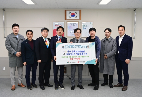 대구 금호로타리클럽(회장 조성혁)·라라코스트 동촌유원지점(대표 이상훈)은 14일, 저소득 아동·청소년을 위해 라라코스트 식사권(3만원) 100매(300만원 상당)를 기탁했다.