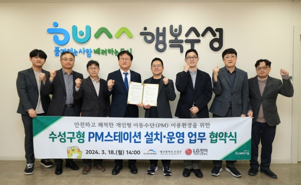 대구 수성구(구청장 김대권)는 18일 LG전자 사내 독립기업인 커런트닷컴퍼니와 PM(개인형 이동수단) 스테이션 설치를 위한 업무협약을 대구시 최초로 체결했다.