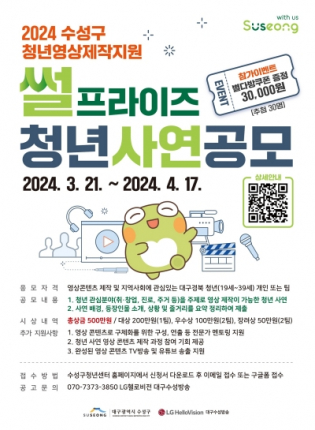 청년영상 제작지원은 수성구가 지난해 대구시 최초로 시도한 것으로, 방송전문가와의 매칭을 통해 청년이 직접 기획한 스토리를 영상 콘텐츠로 제작해 TV 방송 프로그램으로 편성‧송출하는 사업이다.