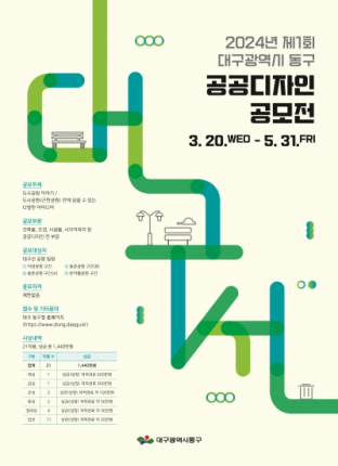 대구 동구청(구청장 윤석준)은 도시공원(근린공원) 안에 담을 수 있는 다양한 아이디어를 발굴하기 위해 ‘제1회 대구광역시 동구 공공디자인 공모전’을 개최한다.