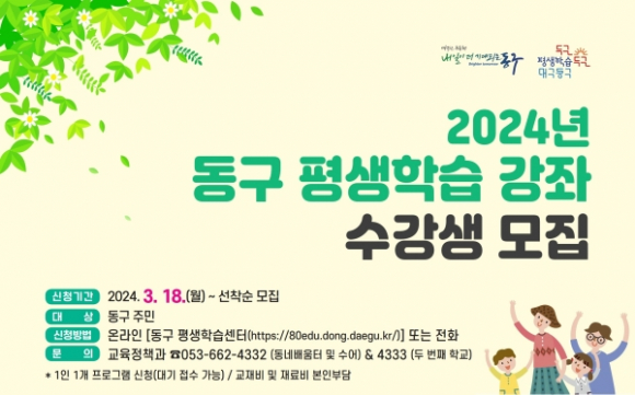 대구 동구청(구청장 윤석준)은 4월 중순까지 ‘2024년 상반기 동구 두 번째 학교 및 동네 배움터’ 평생학습 수강생을 모집한다.