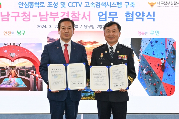 대구 남구청은 지난 27일 남구청 회의실에서 남부경찰서(서장 김상렬)와 안심통학로 조성 및 CCTV 고속검색시스템 구축을 위한 업무협약을 체결했다고 밝혔다.
