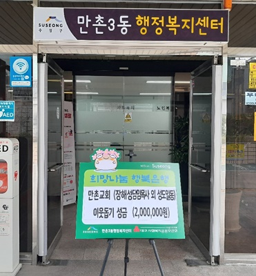 김종완 만촌3동장은 "어려운 이웃에게 관심을 갖고 사랑을 실천해 주셔서 감사드린다. 후원금은 저소득 가정에 소중히 전달하겠다"고 말했다.