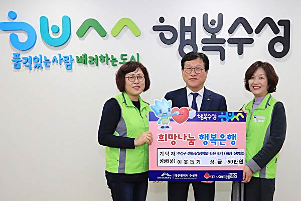 김대권 수성구청장은 “그간 생활공감정책 모니터단 6기로 많은 활동을 해주셔서 감사하며, 보내주신 성금은 저소득 이웃을 위해 잘 쓰겠다”고 말했다.
