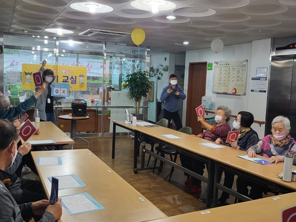 ▲교재를 활용한 손씻기 교육 ▲손씻기 실습 ▲오염도 측정기를 통한 종사자 손 오염 확인 등 교육에서 오엑스(OX) 퀴즈, 미술도구를 활용해 어르신들의 적극적인 참여를 이끌어 내고 있다.