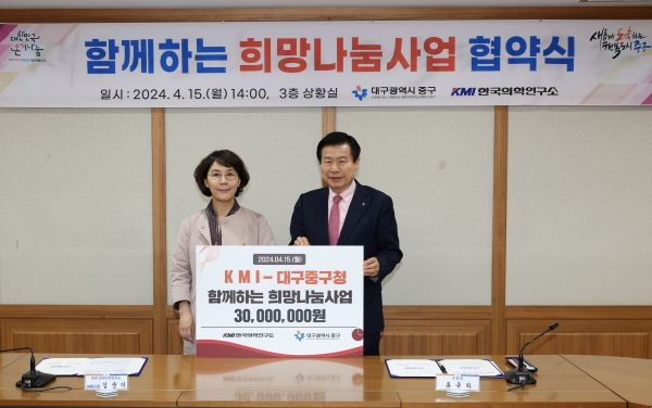 대구 중구(구청장 류규하)는 15일 구청 상황실에서 KMI 한국의학연구소(명예이사장 김순이)와 지역 내 의료취약계층 지원과 유기적인 상호협력체계 구축을 위한 ‘함께하는 희망나눔 협약’을 체결했다.