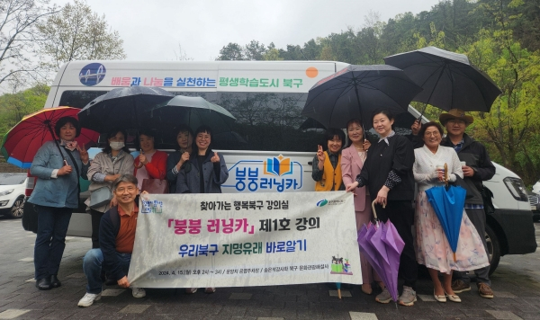 대구 북구청(청장 배광식)은 찾아가는 강의실인 ‘붕붕 러닝카’ 제1호 강의인 “문화해설사와 함께하는 우리북구 지명 유래 알기” 등의 주제로 4월 15일 개최했다.