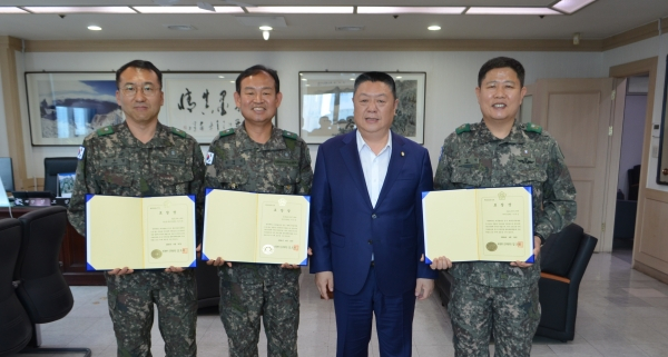 대구 중구의회 김오성 의장은 지난 16일 의회 의장실에서 50사단 대구 중구 예비군지역대장(김영선), 기동대장(박준영), 동인동대장(정두영)에게 표창장을 수여했다.