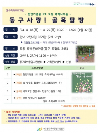 지역 내 자연유산(천연기념물 1호 대구 도동 측백나무 숲)의 가치를 공유하고 부모 자녀 간 열린 소통을 위해 마련된 이 프로그램은 도동 측백문화마을에서 총 6회 진행된다.