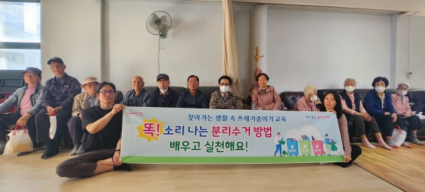 교육 후 20여 명의 어른신들과 함께 분리수거에 앞장서기 위한 결의를 다지는 시간을 가졌다.
