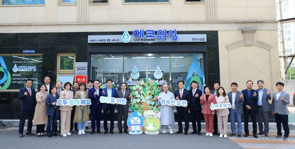 | ↑↑ 지난 18일 열린 대구수성지역자활센터(센터장 정석규) 다회용기 세척사업단 ‘에코워싱 대구수성점’ 개소식에 김대권 수성구청장, 전영태 수성구의회 의장 등이 참석해 기념 촬영하고 있다. |