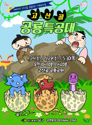 대구 남구는 고산골 공룡공원에서 오는 4월 24일, 5월 29일, 5월 30일, 1일 2회 어린이들을 위한 공연 “고산골 공룡특공대” 를 개최한다고 밝혔다.