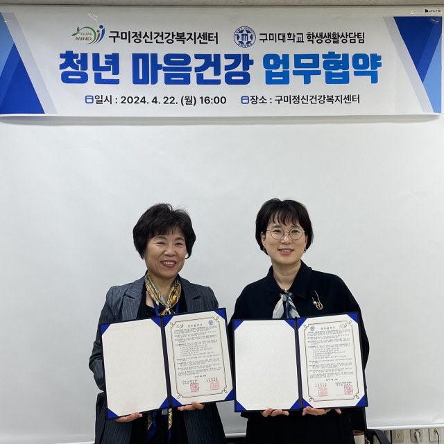 구미정신건강복지센터는 22일 구미보건소에서 청년들의 정신건강 증진을 위해 구미대학교와 업무협약을 체결했다.