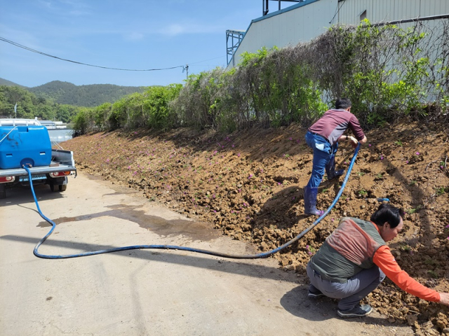 폐비닐·폐부직포 분리배출, 일반쓰레기 배출, 성토 및 꽃잔디 식재로 “깨끗한 농촌만들기” 농로 화단을 조성하였으며 물주기, 비료주기, 제초관리로 꽃잔디가 잘 활착될 수 있도록 할 예정이다.