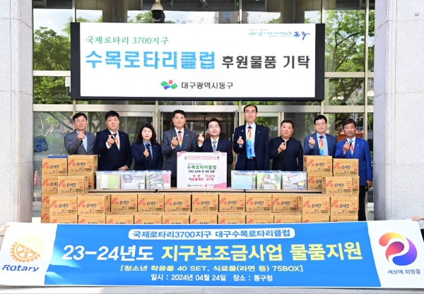 대구수목로타리클럽(회장 김희원)은 지난 24일 어린이날을 앞두고 학용품세트 40개 및 라면 75상자(250만원 상당)를 동구청에 기탁했다.