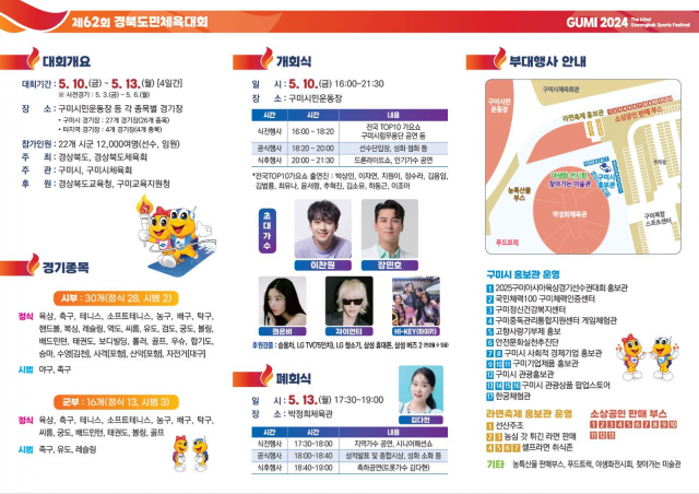 한편, 제62회 경북도민체육대회는 5월 10일부터 13일까지 4일간 구미시민운동장 등 종목별 경기장에서 개최되며, 22개 시‧군이 30개 종목에 참가한다.