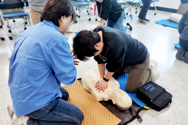 이번 교육은 「경상북도 심폐소생술 교육 운영기관」으로 선정된 김천대학교 산학협력단(심폐소생술 등 응급처치 교육센터)의 방문교육으로 진행되었으며, 심폐소생술 이론 및 실습, 자동심장충격기 (AED) 사용법 및 관리 앱 사용 방법 등 실제상황에서 도움이 되는 실습 위주로 진행되었다.