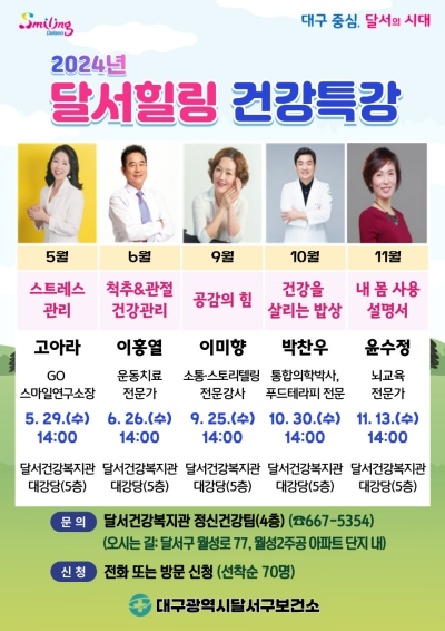 「달서힐링 건강특강」은 지난해 10월 신축 개관한 달서건강복지관에서 추진하는 건강 특화 강연프로그램으로서, 오는 5월 29일 첫 강연을 시작으로 11월까지 총 5회에 걸쳐 진행할 예정이다.