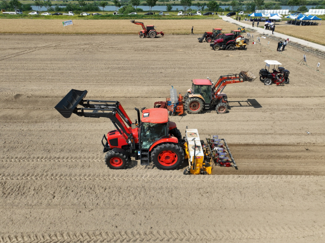 밀, 콩 재배농가 등 150여 명이 참석한 이번 연시회에서 밀 수확 후 밀짚 파쇄, 배수 개선, 콩 정밀파종 방제 등을 이용한 밀+콩 전과정의 기계 작업을 선보였다.