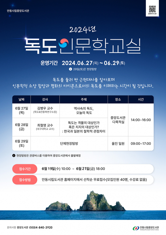 안동시립도서관은 6월 27일(목)부터 29일(금)까지 3일 동안 『2024 안동시립중앙도서관 독도인문학교실』을 운영한다.