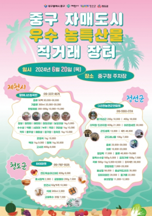 이번 직거래장터에서는 대구 중구와 자매 결연을 맺은 제천시, 정선군, 청도군 지역에서 생산된 다양한 품목의 농특산물이 판매된다.