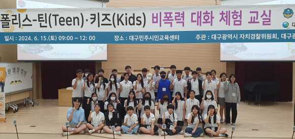 대구광역시 자치경찰위원회(위원장 이중구)는 대구광역시교육청과의 긴밀한 협력을 바탕으로 6월 15일(토) 대구민주시민교육센터에서 ‘폴리스-틴(Teen)·키즈(Kids)’를 대상으로 ‘비폭력대화* 체험교실 및 교육연극’ 프로그램을 운영했다.