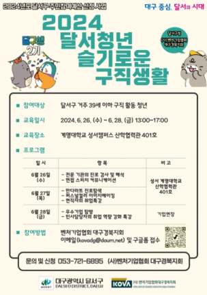 달서구는 6월 26일부터 29일까지 달서청년 슬기로운 구직생활 2기 프로그램이 운영될 계획이다. 6월 25일까지 홍보포스터 내 QR코드 접속을 통해 신청할 수 있고, (사)벤처기업협회 대구경북지회(☎721-6894)와 달서구 일자리지원과(☎667-2665)로 문의하면 된다.