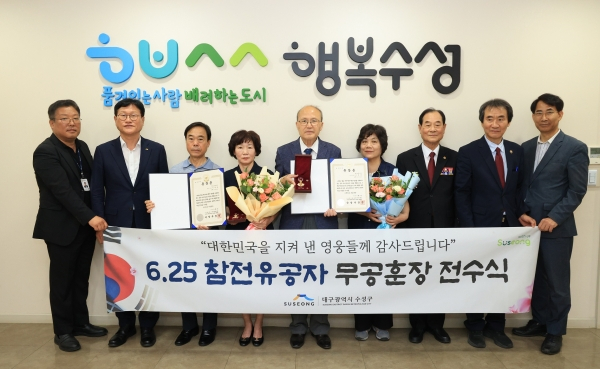 수성구는 6·25전쟁 당시 무공훈장 서훈 대상자로 결정됐으나 훈장을 받지 못한 공로자를 찾아 무공훈장을 수여하는 국방부 육군본부 ‘6·25전쟁 무공훈장 찾아주기 사업’을 통해 이복송 중사의 조카 서선주 씨, 이석준 상병의 아들 이원일 씨에게 훈장을 전달했다.