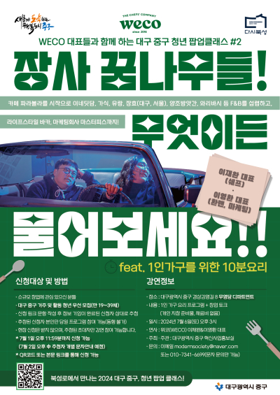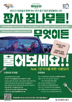 무영당에서 두 번째로 열리는 클래스는 중구 삼덕동에 기반을 두고 있는 청년 창업 요식 브랜드 위코(WECO)의 공동대표 2인(이재완, 이영환)을 초청해, 1인 청년가구를 위한 요리 체험 프로그램과 함께 창업 토크 콘서트 형식으로 진행된다.