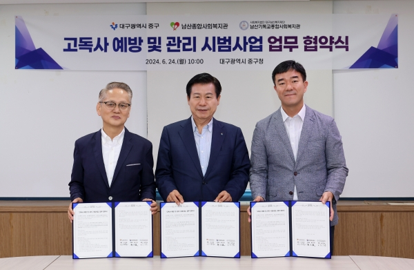 대구 중구(구청장 류규하)는 24일 구청 소회의실에서 고독사 예방 및 관리 시범사업 추진을 위해 남산종합사회복지관(관장 신상윤), 남산기독교종합사회복지관(관장 심영숙)과 업무협약을 체결했다.