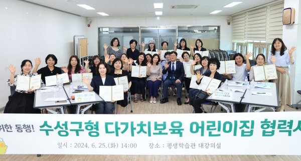 대구 수성구는 25일 범어도서관 평생학습관 대강의실에서 소규모어린이집 간 공유·나눔·상생을 위한 ‘수성구형 다가치 보육 어린이집 협력사업 발대식’을 개최했다.