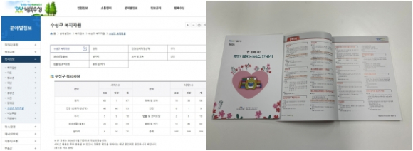 | ↑↑ 수성구청 홈페이지에 새로 신설된 ‘수성구 복지자원’ 메뉴(좌), 수성구가 발간한 ‘한눈에 쏙! 주민복지서비스 안내서’ 책자(우) |