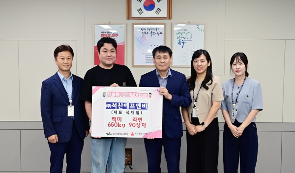 ㈜석산에프앤비(대표 석재철)는 지난 8일, 지역사회 소외되고 어려운 이웃을 위해 사용해 달라며 백미 650kg와 라면 90상자를 동구청에 기탁했다.