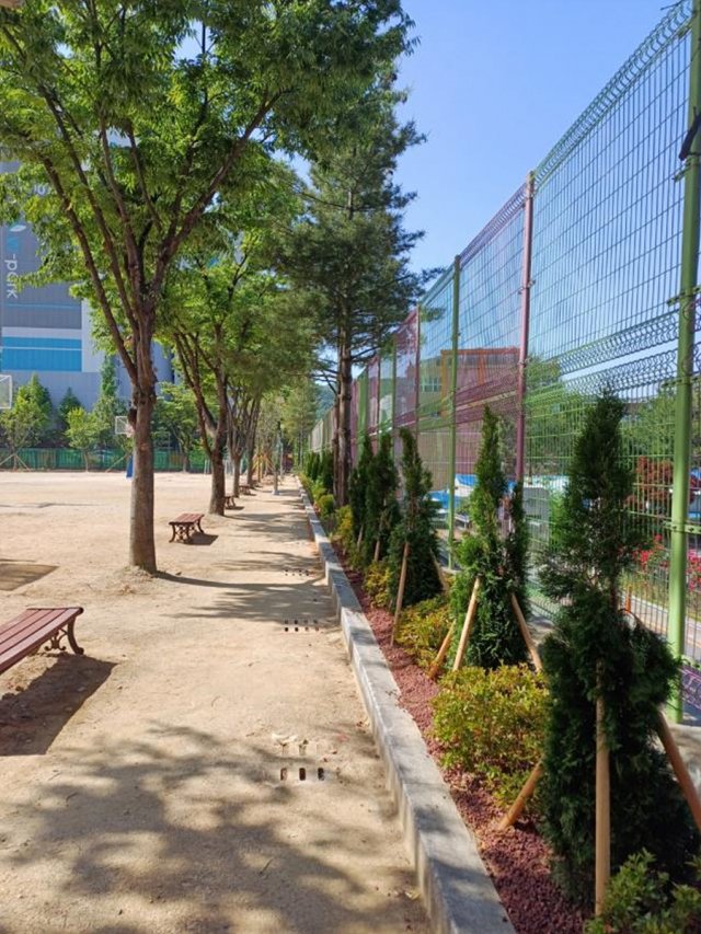서재중학교(달성군)는 화단숲에 느티나무 그늘목을 설치해 폭염피해를 예방했고 에메랄드그린 등 경관수목 및 초화류를 식재하여 쾌적한 생활환경을 제공했다.