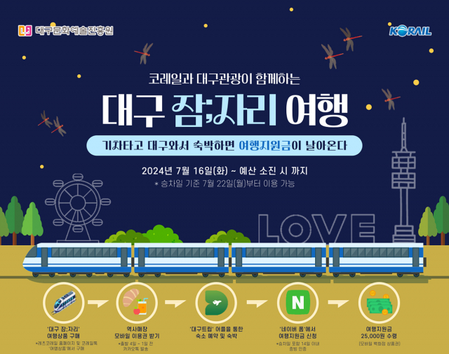 대구광역시와 (재)대구문화예술진흥원(이하 ‘문예진흥원’) 관광본부는 한국철도공사(이하 ‘코레일’)와 함께 열차를 타고 대구를 방문하는 관광객을 대상으로 여행지원금을 지원하는 대구관광 숙박 프로모션 ‘대구 잠;자리 여행’을 진행한다.