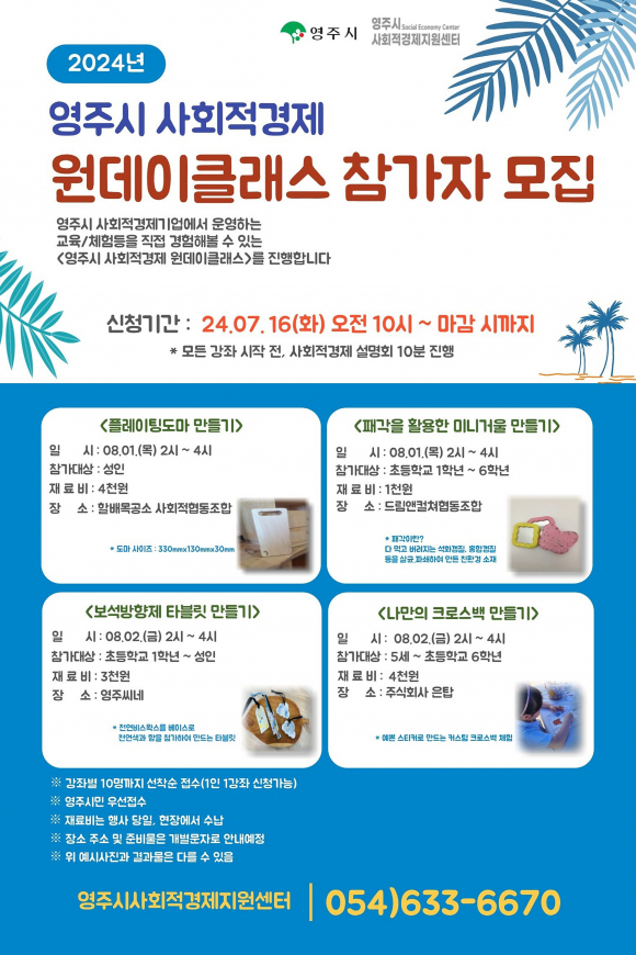 영주시와 영주시사회적경제지원센터에서 진행하는 ‘영주시 사회적경제 원데이클래스’ 참여자를 오는 16일부터 31일까지 모집한다.