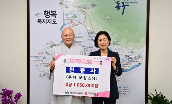 천둥사(보원 주지스님)는 지난 16일, 산사음악회 개최를 통해 마련된 수익금 105만원을 어려운 이웃을 위해 사용해달라며 동구청에 기탁했다. 기탁받은 성금은 동구 지역 내 저소득가정에 전달할 예정이다.