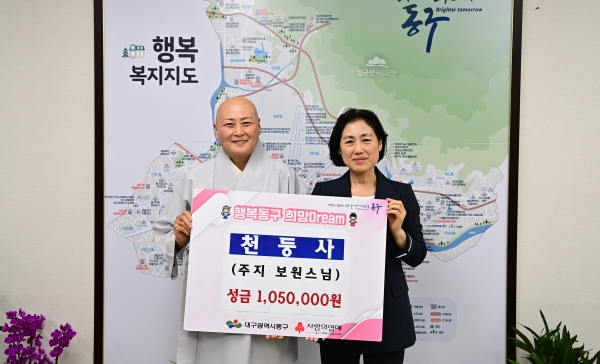 | ↑↑ 천둥사(보원 주지스님)는 지난 16일, 산사음악회 개최를 통해 마련된 수익금 105만원을 어려운 이웃을 위해 사용해달라며 동구청에 기탁했다. |