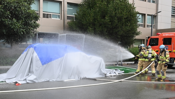 대구 남구는 7월 18일 직원들의 전기자동차 화재대응 역량강화를 위해 대구 중부소방서와 합동으로 자체 훈련을 실시하였다.