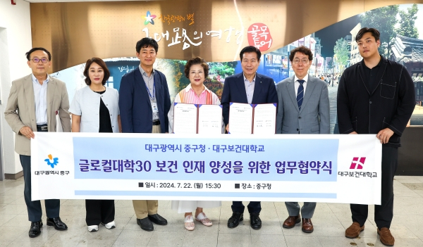 대구 중구(구청장 류규하)는 22일 구청 상황실에서 대구보건대학교(총장 남성희)와 글로컬대학30 보건 인재 양성을 위한 업무 협약을 체결했다.