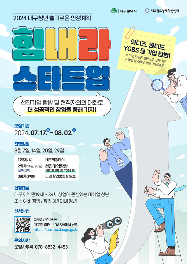 대구광역시는 예비창업자 또는 창업 3년 이내 청년 및 창업에 관심 있는 미취업 청년을 대상으로 창업 네트워킹을 형성하고 선진기업을 탐방할 기회를 제공하는 ‘대구청년 힘내라 스타트업(Start-Up)’ 참가자를 8월 2일(금)까지 모집한다.