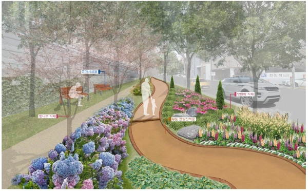 숲 산책로 주변에는 사계절 꽃을 즐길 수 있도록 수국, 칠자화, 모란, 병꽃나무 등 34종 15,195본의 관목과 지피식물을 다층으로 식재해 철도변 완충녹지의 열악한 환경을 개선하고 기후변화에 적극적으로 대응할 계획이다.
