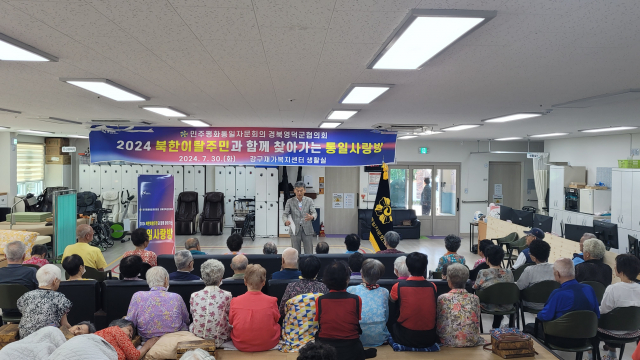 이날 강의는 김성락 회장의 ‘통일환경 급변에 따른 북한 변화 및 국론 결집방안’과, 북한이탈주민 이동월씨의 ‘북한이탈주민인에게 직접 듣는 북한 이야기’, 한국국학진흥원 이야기 할머니로 활동하고 있는 원충희 탈북민지원분과 위원장의 ‘따뜻한 동행 탈북민과 함께’라는 세 가지 주제로 어른신들의 눈높이에 맞는 이야기 형식으로 진행하였다.